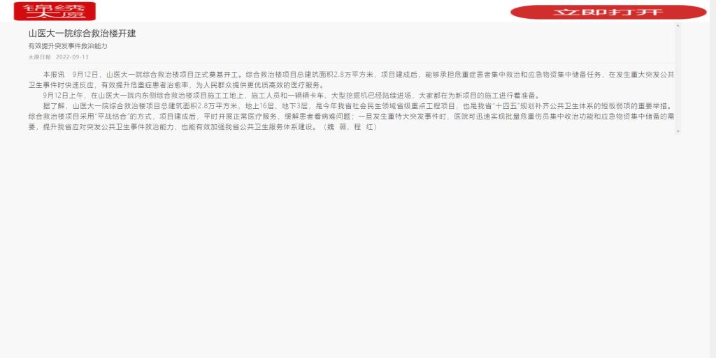 太原日报|山医大一院综合救治楼开建 有效提升突发事件救治能力