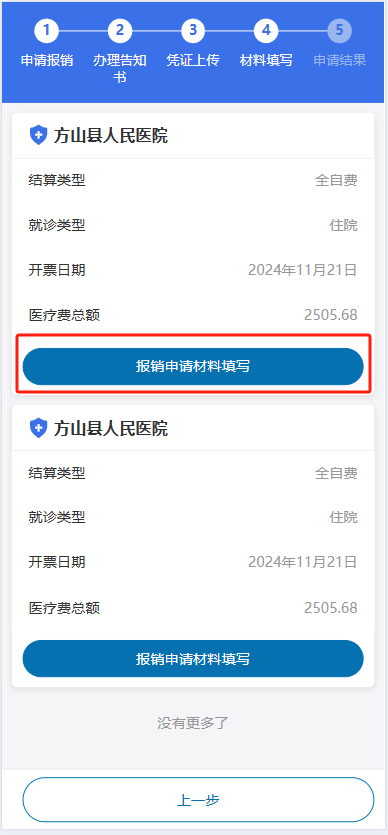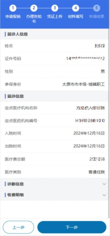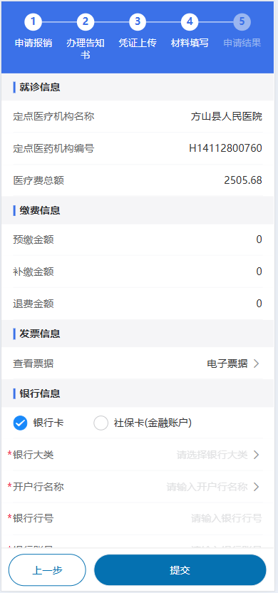 5.选择需要进行材料填写的数据,点击“报销申请材料填写”进行材料填写操作。确认就诊人信息、就诊信息、诊断信息、收费明细,填写银行卡或社保卡(金融账户)信息。