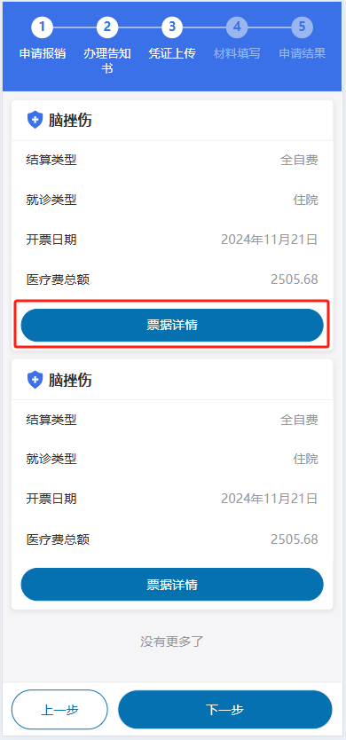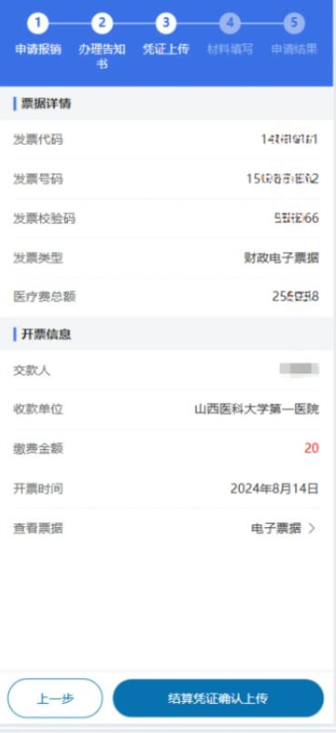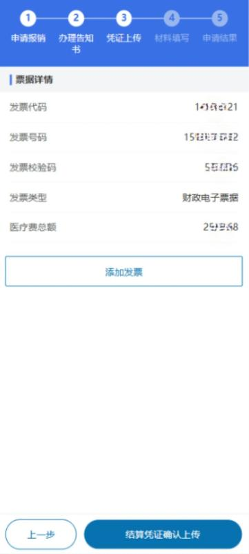 4选择需要进行报销申请的数据,点击“票据详情”进行票据上传操作。点击添加发票,加载发票信息;确认发票信息无误,点击底部“结算凭证确认上传”;上传成功后会进入“材料填写”步骤。