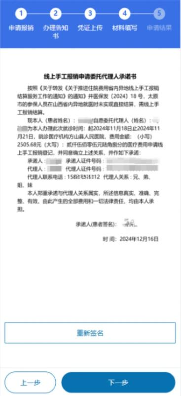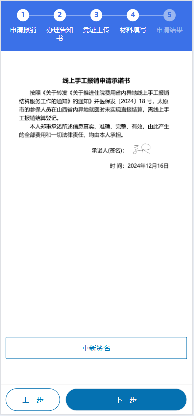 6.线上手工报销申请承诺书“为自己报销”和“为他人报销”承诺书有所区别,查阅承诺书确认后签名。点击下一步并提交即可。
