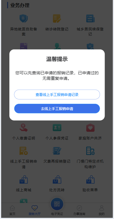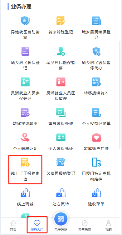 2.点击左下角“服务大厅”,在“业务办理”版块点击“线上手工报销申请”——选择“去线上手工报销申请”。