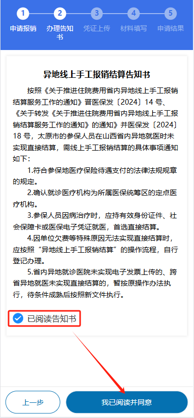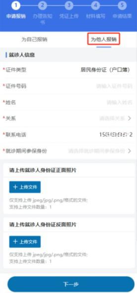 3.选择“为自己报销”或者“为他人报销”办理业务,按要求填写就诊人相关信息。为他人办理的需要上传就诊人身份证照片和代办人信息。信息填写完成后,点击阅读办理告知书进行下一步操作。