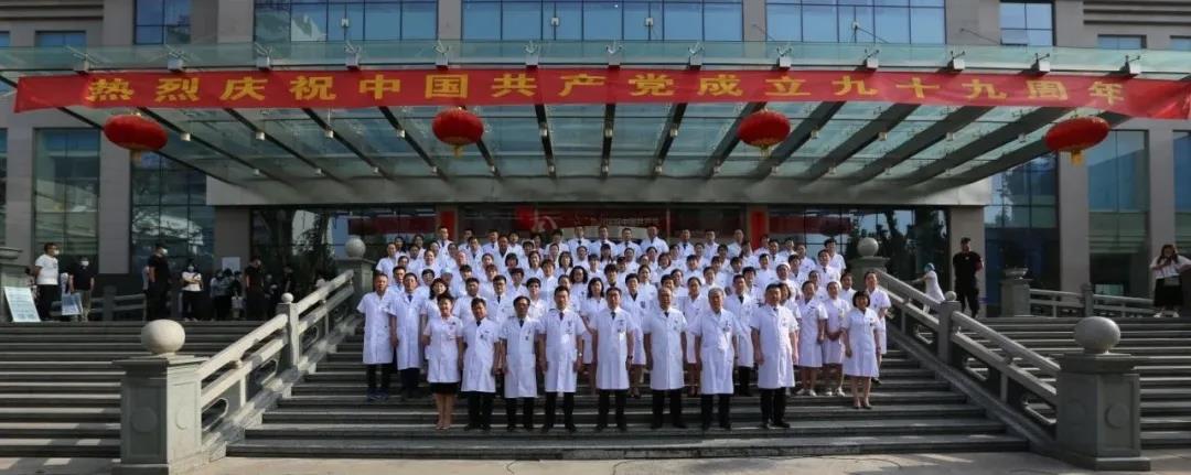 在一号住院楼前广场举行庆祝建党99周年新党员入党宣誓暨老党员重温入党誓词仪式。全体在院领导、2020年新发展党员、在抗击新冠疫情一线入党的党员、老党员代表100余人参加宣誓仪式。院党委副书记、院长徐钧主持仪式。
