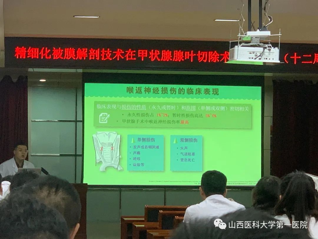 刘静主任以“如何践行甲状腺结节的规范化诊疗”为题,详细讲解了在现有条件下如何践行甲状腺结节的诊疗规范,同时对中铁十二局集团有限公司中心医院甲状腺外科的发展困惑给予解答。刘赟副主任医师针对“精细化被膜解剖技术在甲状腺腺叶切除术中应用——甲状腺手术中如何保护喉返神经和甲状旁腺”为题,针对甲状腺手术中如何精细化切除甲状腺以及术中遇到喉返神经、甲状旁腺等重要组织如何保护做出讲解,同时对开展甲状腺外科手术中遇到的困难进行解答。李曙晶主治医师以“浅谈不同入路腔镜甲状腺手术”为题,向在座医护工作者讲解了腔镜甲状腺手术的基础知识,并针对开展腔镜手术的疑难点进行答疑解惑。