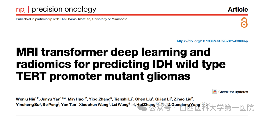 原文链接:Niu, W., Yan, J., Hao, M. et al. MRI transformer deep learning and radiomics for predicting IDH wild type TERT promoter mutant gliomas. npj Precis. Onc. 9, 89 (2025). //doi.org/10.1038/s41698-025-00884-y.