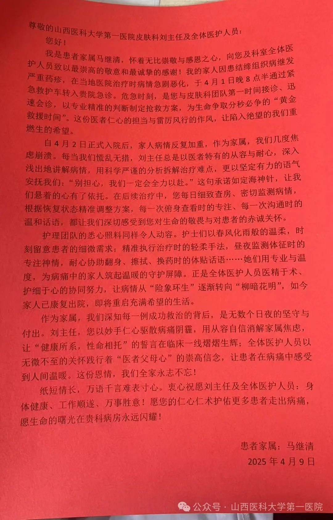 皮肤科病房内温情涌动,一位曾命悬一线的重症药疹患者王女士及其家属将一面“胸有乾坤稳解沉疴险,心含仁爱细护康复程”的锦旗和一封饱含深情的表扬信,郑重地送到皮肤科医护团队手中,以感谢在生死关头全力以赴、创造生命奇迹的大爱之举。