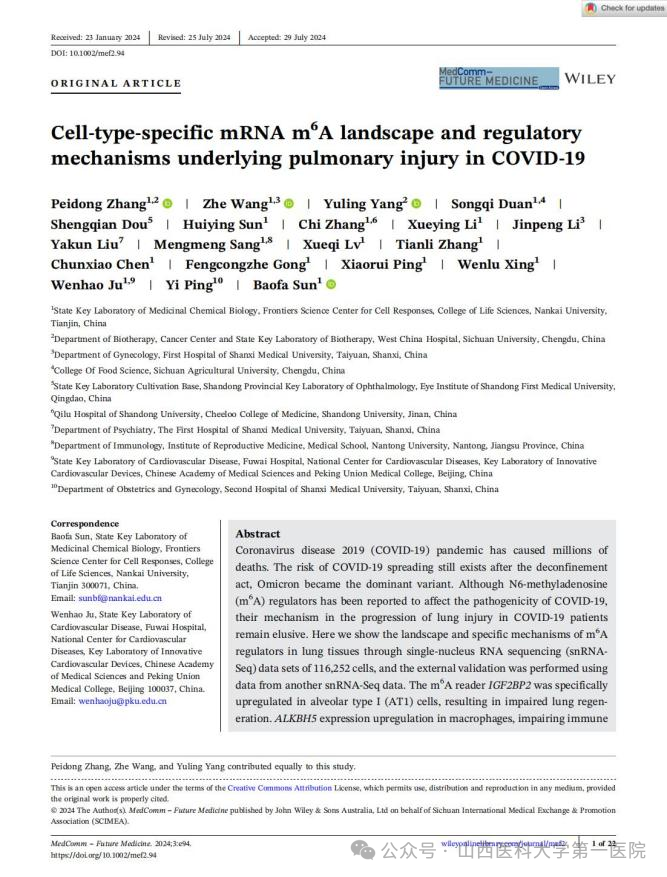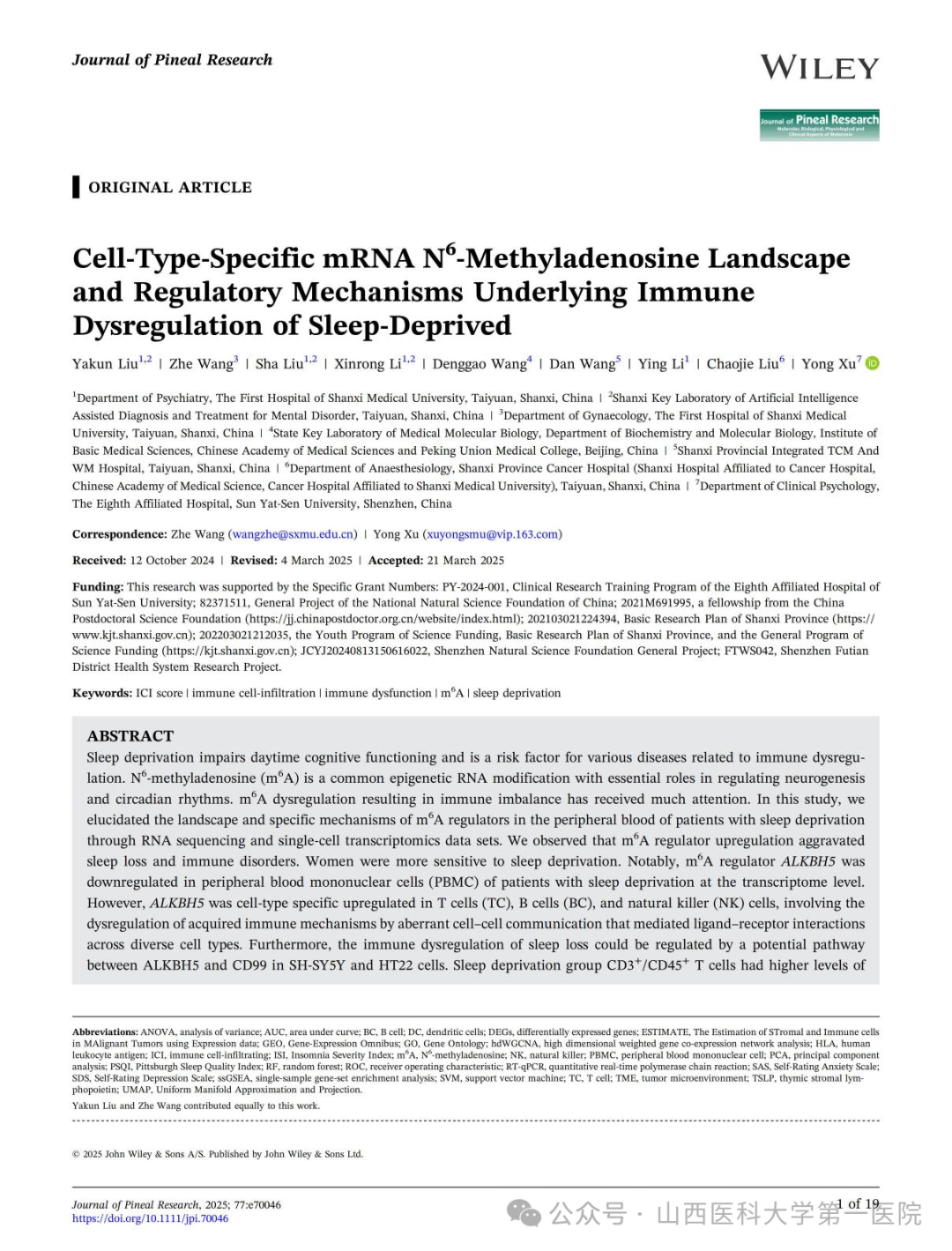 妇科王哲主治医师以并列第一作者及通讯作者在JOURNAL OF PINEAL RESEARCH(中科院分区1区TOP,五年IF=10.3)发表了题为“Cell-Type-Specific mRNA N6-Methyladenosine Landscape and Regulatory Mechanisms Underlying Immune Dysregulation of Sleep-Deprived”的原创性论著。失眠症困扰着全世界人类的免疫健康,文章发现并绘制了女性患者在先天免疫细胞中失调的m6A单细胞图谱并用多模型进行验证,为女性睡眠障碍患者的免疫调控层面提供精准防治及新的治疗靶点。