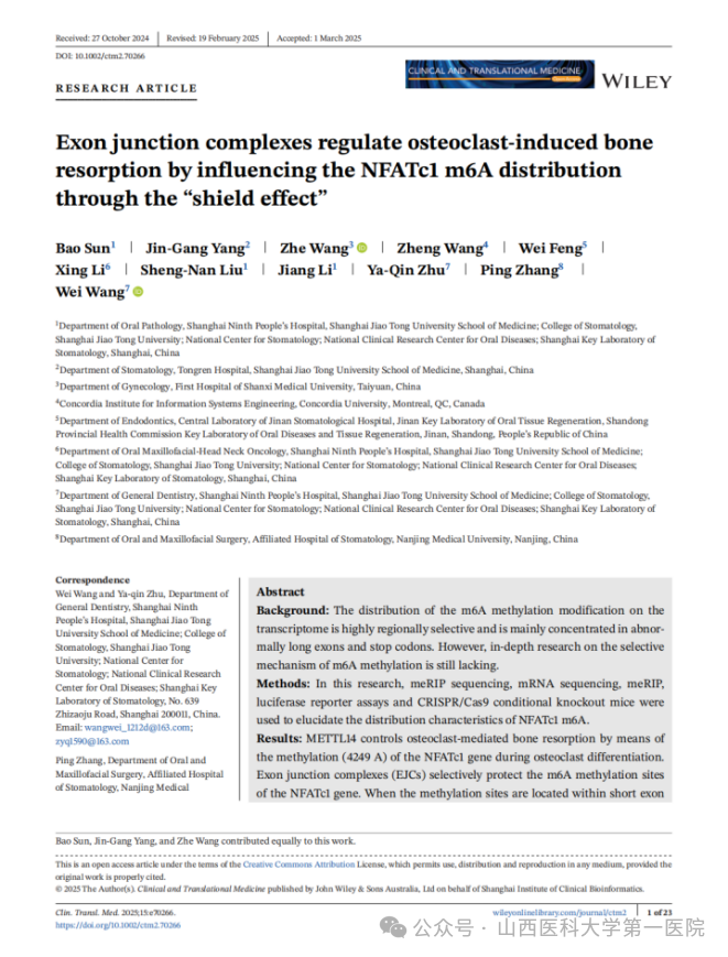 同时,王哲主治医师在CLINICAL AND TRANSLATIONAL MEDICINE (中科院分区1区,五年IF=8)也有斩获,以共同第一作者发表了题目为“Exon junction complexes regulate osteoclast-induced bone resorption by influencing the NFATc1 m6A distribution through the “shield effect”的原创性论著,为m6A表观修饰在多疾病的调控作用提供了新的视角。