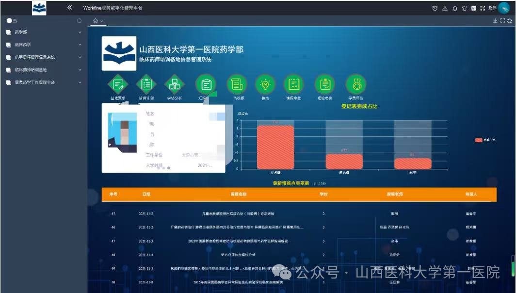 基地现有硕士生导师2名,具有临床药师培训资质的带教老师11名,配备临床药师18名,涵盖抗感染、肿瘤、肾病、心内、内分泌、ICU、儿科、老年、精神、呼吸、中医等15个专业方向,师资覆盖专业及培训学员数量均位列全省首位;近年来在教学管理、质量控制、实践能力提升方面持续发力,建立了“导师制+模块化+个性化”培训机制,自主开发学员培训工作站,实行培训全过程质量跟踪,形成从入培评估、阶段考核、教学查房到结业答辩的闭环管理体系,特别注重案例教学与多学科合作,临床药师深度参与查房、会诊、处方前置审核、用药教育和个体化治疗方案制定,显著提升了药师临床胜任力和人文服务素养。