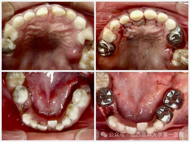 手术当天在麻醉科经鼻插管全气道管理全身麻醉下,口腔内科采用微创去腐复合树脂美学修复、牙髓根管治疗、牙髓切断术以及预成冠技术恢复患牙的形态及功能;口腔颌面外科团队微创拔除2颗埋伏牙多生牙,患儿术后2小时完全苏醒,经观察无任何不适于第二日上午离院。