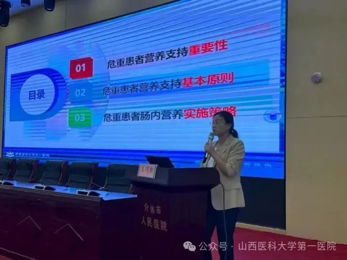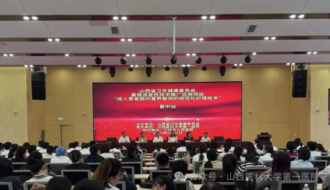 护理部副主任唐珊带领护理专家团队赴介休市人民医院,开展了由山西省卫生健康委员会主办的基层适宜性技术推广项目——成人患者肠内营养管饲的规范化护理技术专题培训。介休市人民医院组织院内护理骨干二百余人参加。