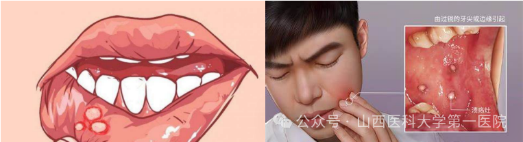 - 牙齿尖锐、假牙不合适或牙套摩擦