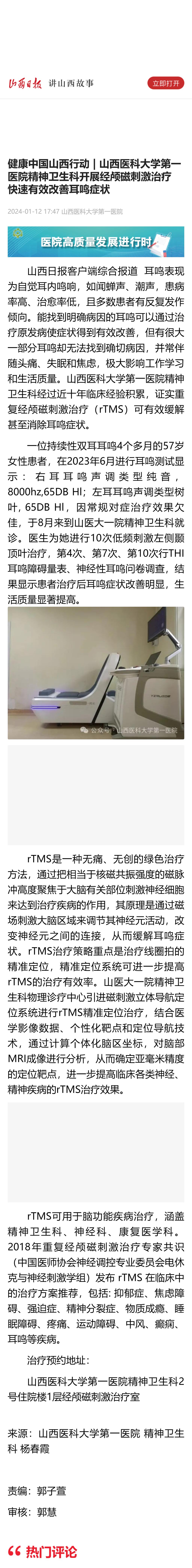 山西日报客户端|健康中国山西行动 | 东京热 精神卫生科开展经颅磁刺激治疗 快速有效改善耳鸣症状