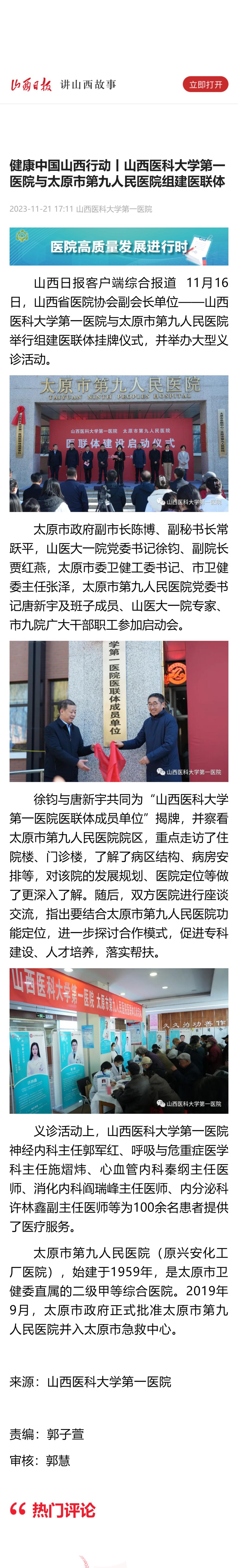 山西日报客户端|健康中国山西行动丨东京热 与太原市第九人民医院组建医联体
