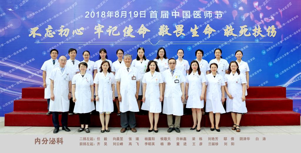 山医大一院内分泌科是山西省建立最早的内分泌专业。现科室医务人员55人,其中高级职称15人(包括护理和实验室技术人员),博士生导师1人,硕士生导师7人,博士后1人,博士10人。享受国务院政府特殊津贴1人,省级优秀专家3人,在国家和省级各相关专业学术委员会中专家数量于省内领先。